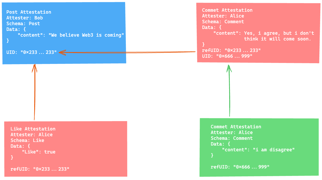 Another use case is for social media platform. Bob can create a “post” attestation with uid 0x233…2233 representing his post. Alice can create a “like” attestation and a “comment” reference to 0x233…2233 respectively, representing Alice’s like and comment to Bob’s post. Meanwhile, Anne also can create a “comment” attestation referencing to Alice’s comment as Anne’s recommend to Alice’s comment.