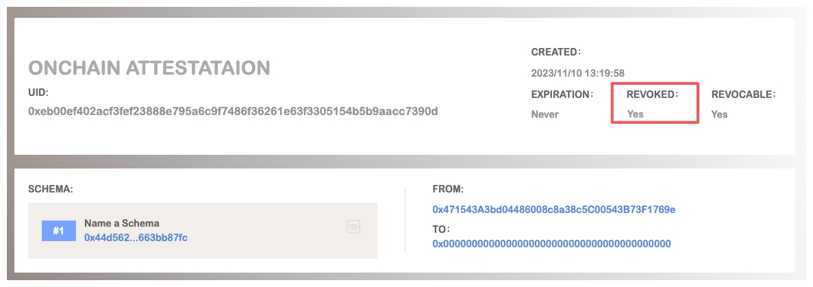 As for on-chain attestations, attestors of attestations can call revoke function of BAS contract to mark an attestation as invalid. When an on-chain attestation is revoked, the revoked field will be set true. While the attestor also can call revokeOffchain(bytes32) to revoke an off-chain attestation. Where the input of revokeOffChain is the uid of the attestation that you want to revoke. When an off-chain attestation is revoked, BAS contract will mark the attestation as revoked.