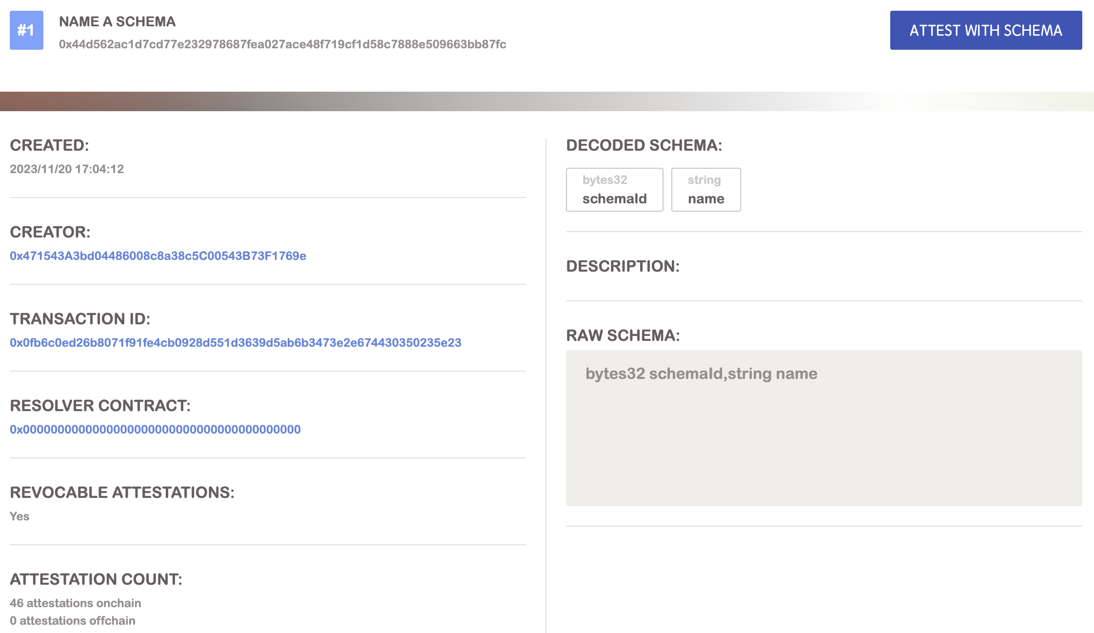 Schema #- An incrementally assigned number that is not a unique identifier.UID- A unique universal identifier exclusively assigned to the schema.Creator- The wallet address responsible for creating the schema.Transaction ID- The Ethereum transaction ID registering the schema on BAS.Resolver- An optional contract designated to the schema for more intricate use cases.Attestation Count- The total number of attestations, whether on or off-chain, associated with the schema.Schema- The ABI encoded field types within the schema.
